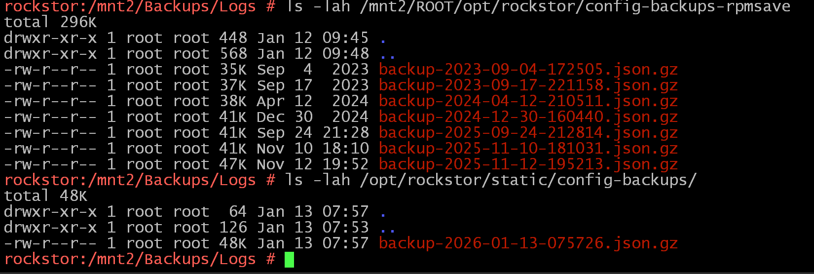 [13/Jan/2026 07:50:30] ERROR [storageadmin.views.config_backup:651] [Errno 2] No such file or directory: ‘/opt/rockstor/static/config-backups/backup-2025-11-12-195213.json.gz’