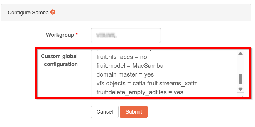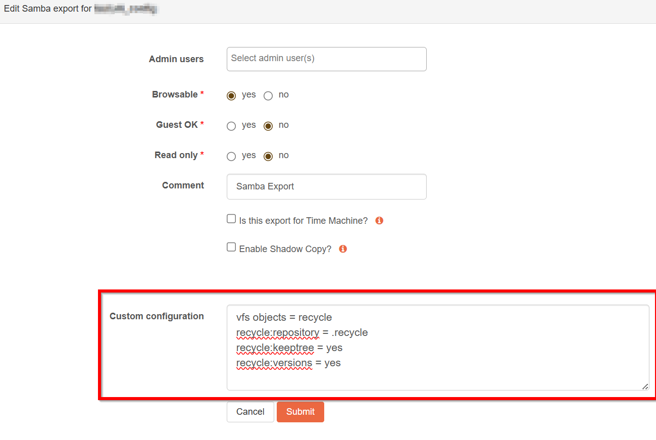 @johnc hello again. Thanks for the writeup on this. Instead of directly updating the smb.conf, you should be able to place these additional parameters directly into the Samba service or share definition (depending on whether the recycling bin should be active for all or just for individual shares). That way, the information is stored in the database and during configuration backups: